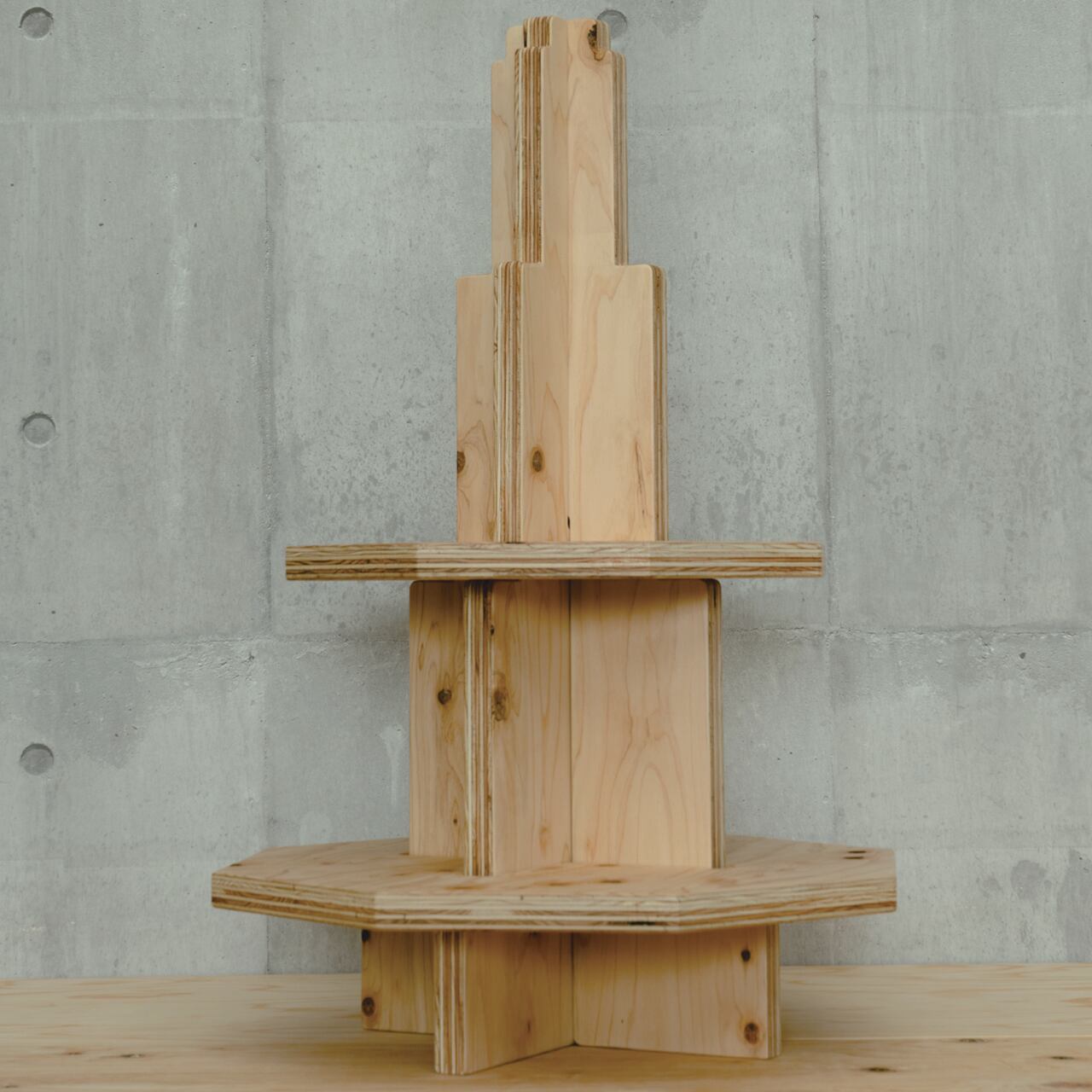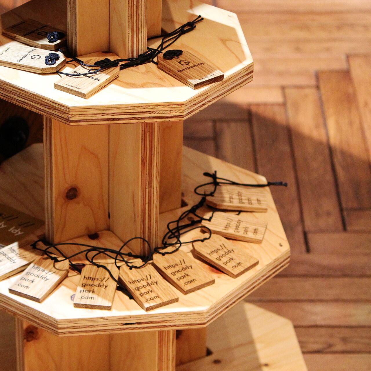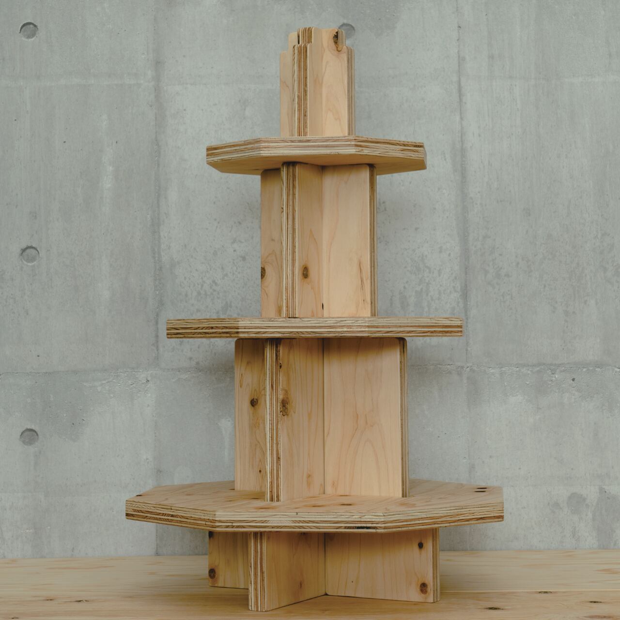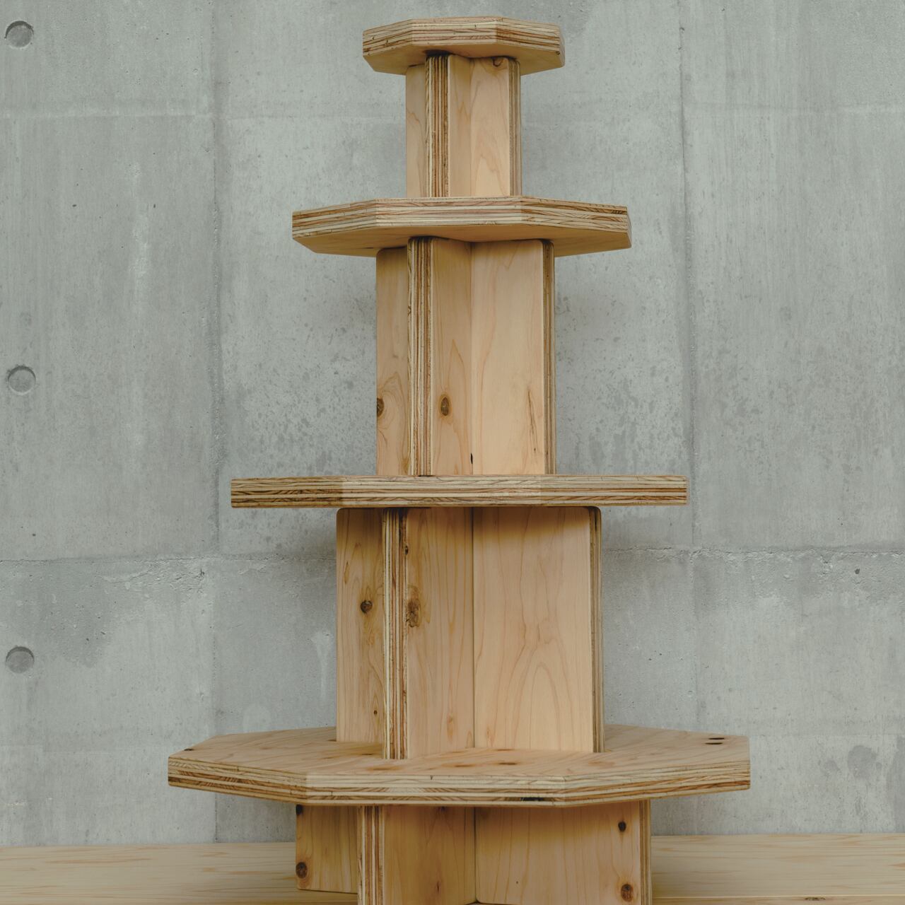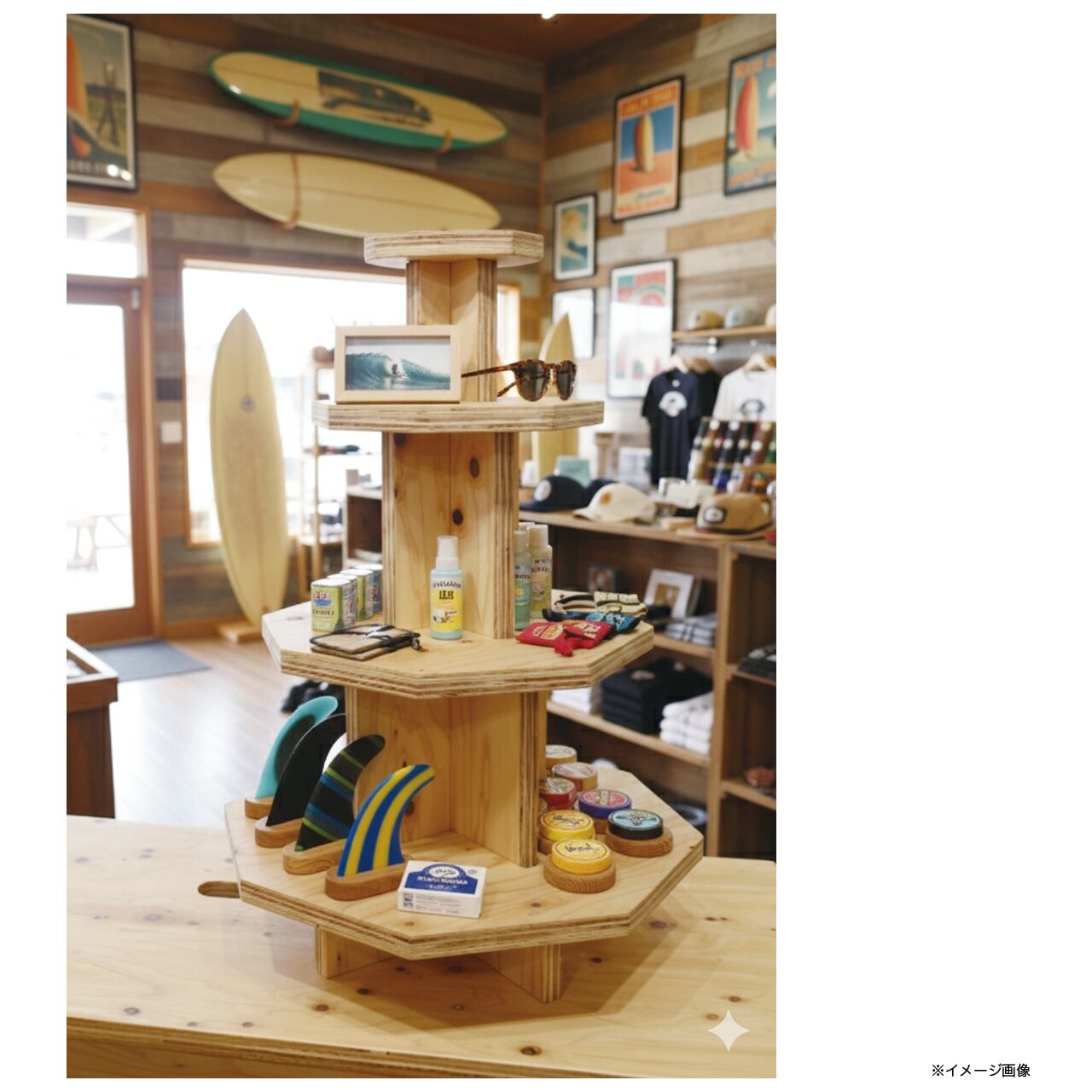 国産ヒノキ合板の豊かな木目が魅力の、タワーラックディスプレイ。